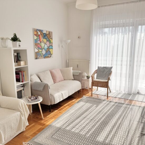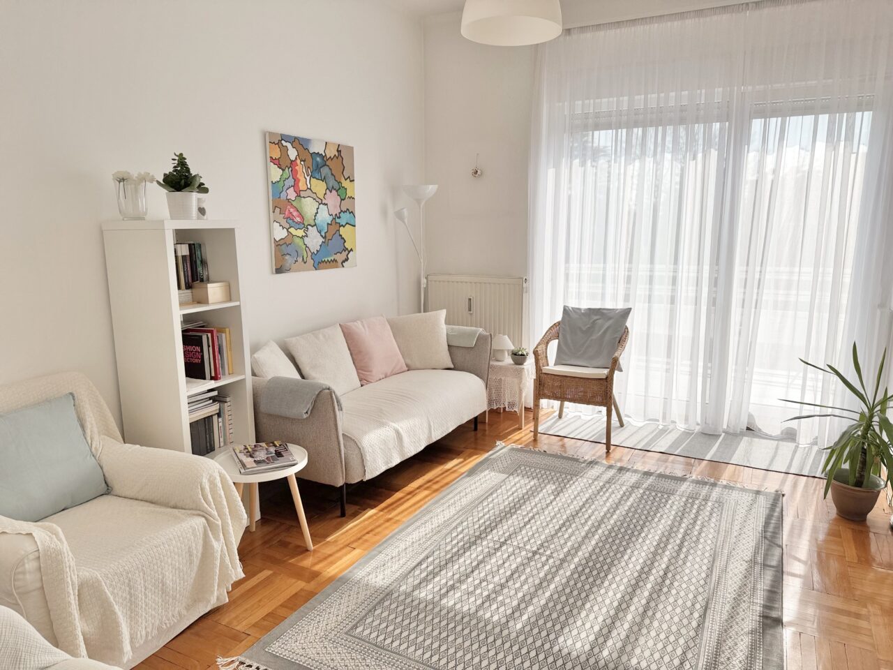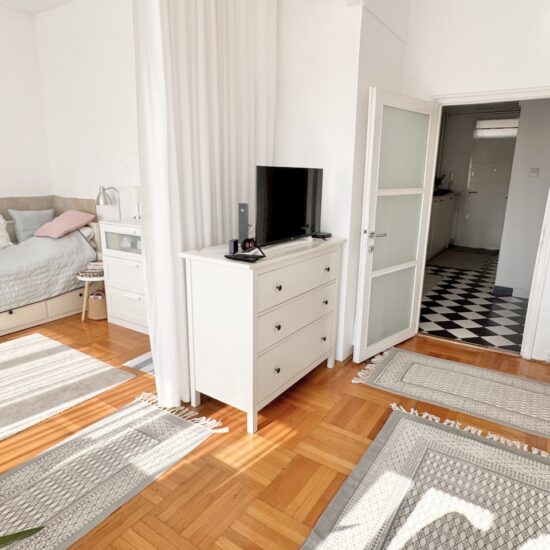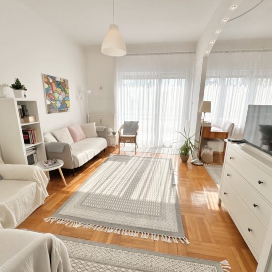 Nappali szoba előtt városi panorámás erkély helyezkedik el.