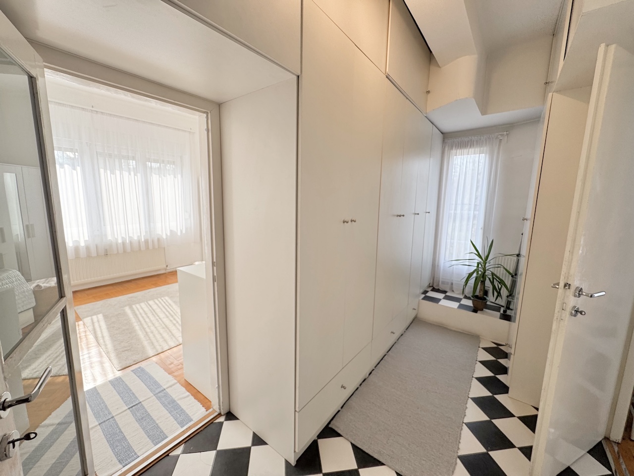 A lakás a ház I. emeletén helyezkedik el, 67 m2-es, 3 szobás, 2 erkélyes,